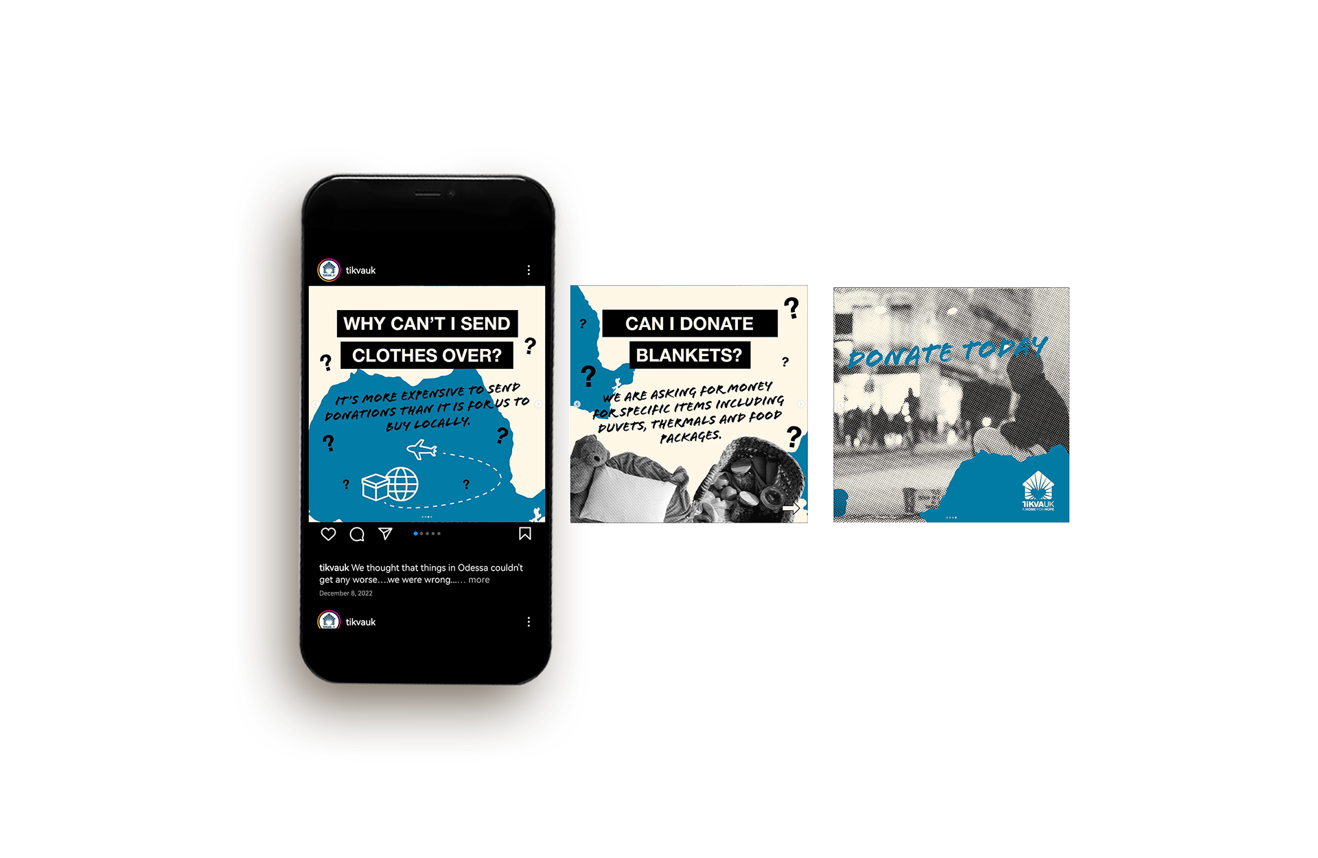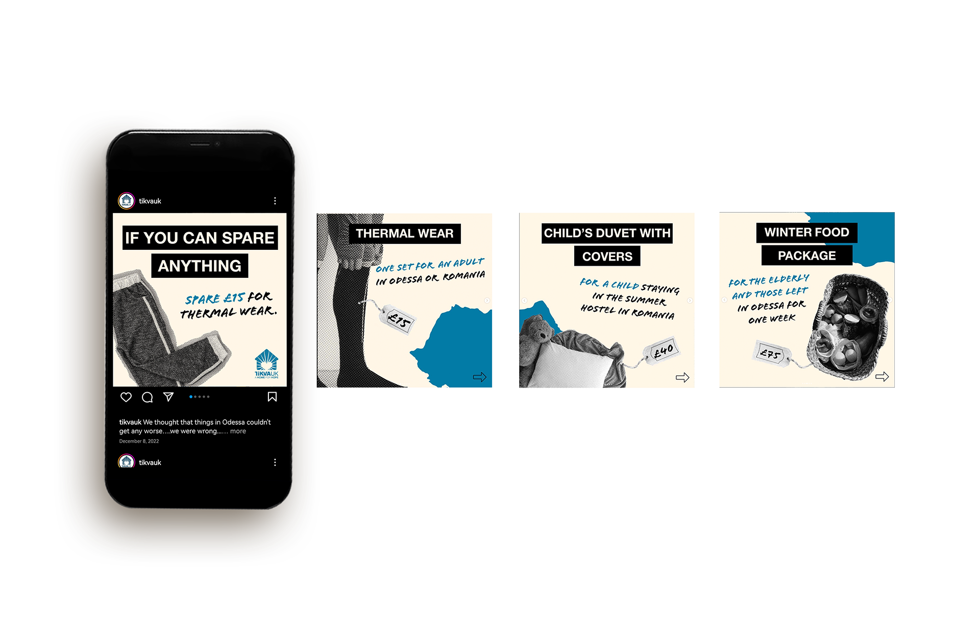 In 2025, while working with Creative and Commercial London, I designed a series of social media graphics for the Tikva Odessa campaign, which encouraged donations of clothing for children affected by the ongoing conflict. I created visually clear, compassionate, and brand-aligned assets that helped communicate the urgency of the appeal and drive meaningful engagement across digital platforms.